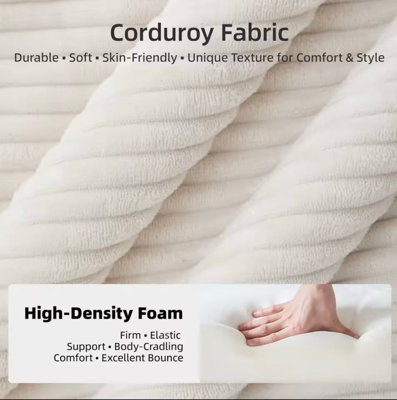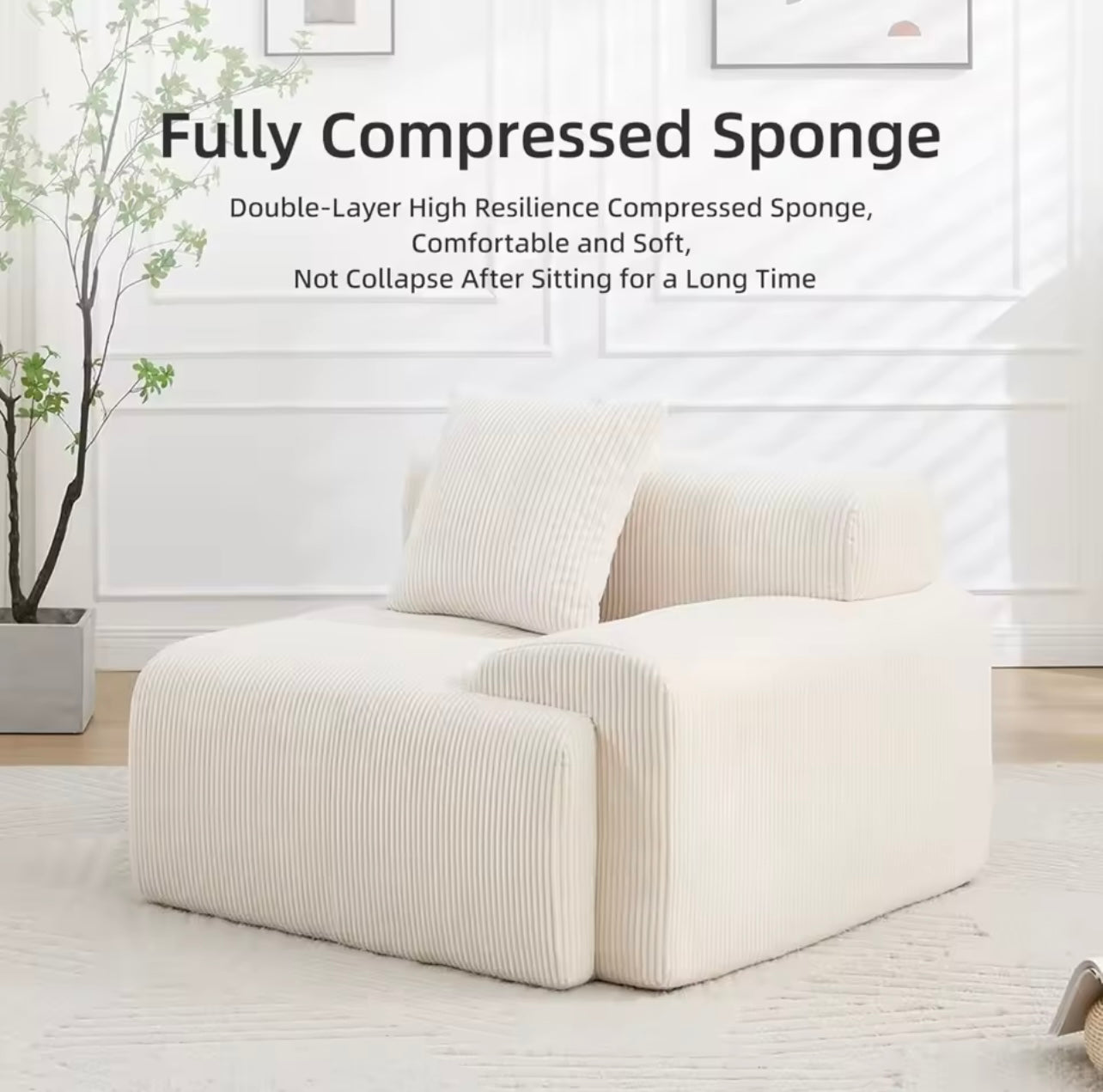 Upholstered in ultra-soft plush corduroy, the texture feels warm, cozy, and cloud-like. The deep seat and high-resilience sponge structure provide supportive comfort for lounging, relaxing, or napping. The gentle, modern color easily complements minimalist, contemporary, and cozy interiors.