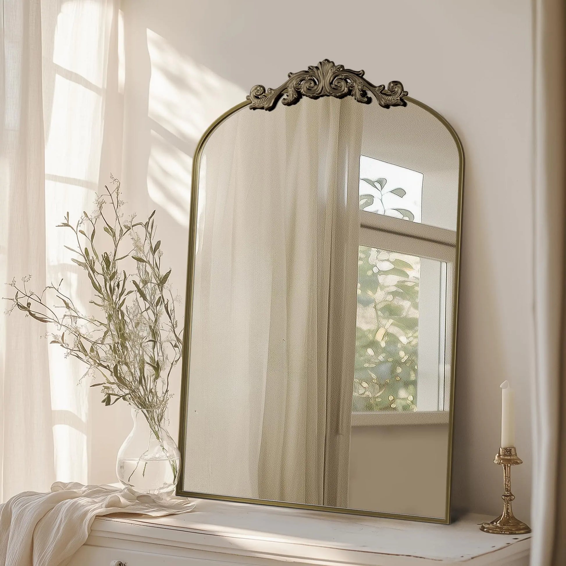 Add a touch of vintage elegance to any room with this 22”x30” arched wall mirror. Featuring a bronze antique carved metal frame, this mirror is perfect for bathrooms, bedrooms, living rooms, entryways, or even above a fireplace.
