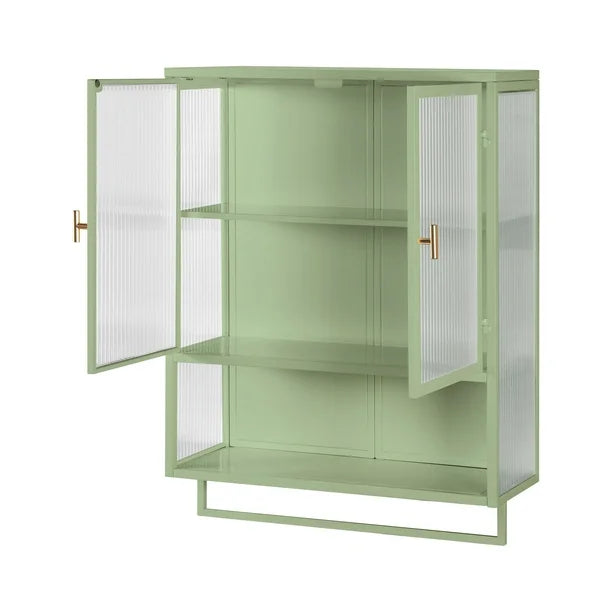 Add style and functionality to your home with this green double-door wall cabinet. Designed with a compact 23.62” width, it features two enclosed storage levels, an open shelf, and a towel rail. Made of iron and fluted tempered glass, this cabinet combines modern simplicity with durability.