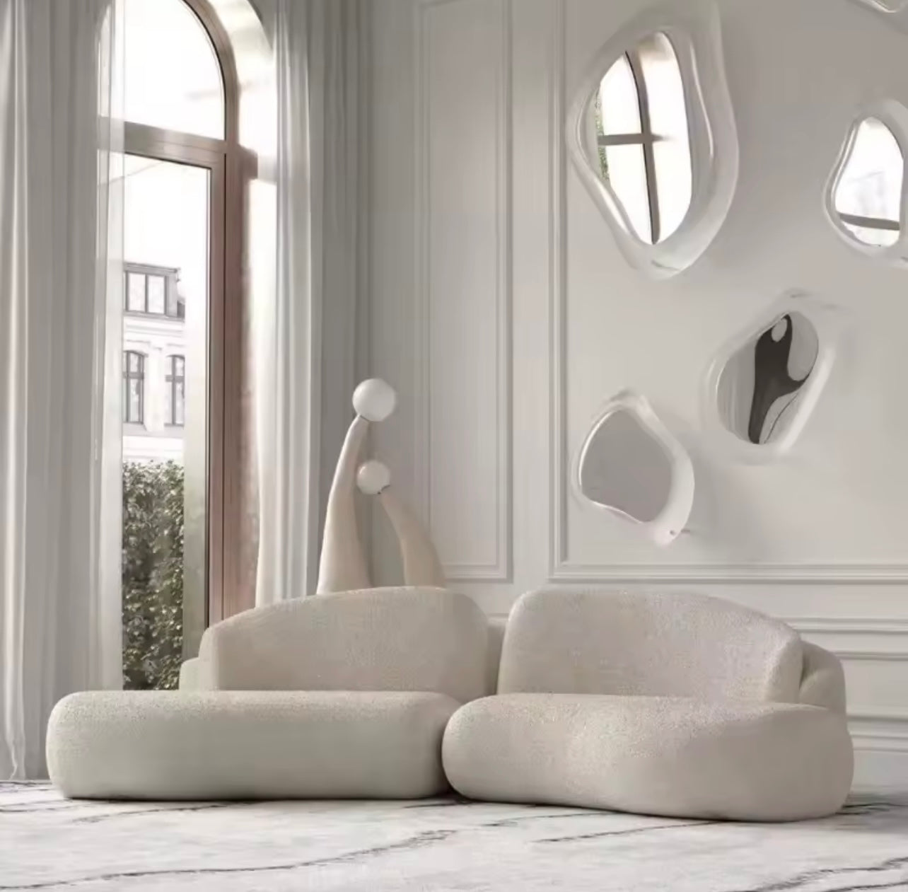 European curved modern sofa in white with sherpa or velvet upholstery. Comfortable, stylish, durable, and easy to clean – perfect for any living room.