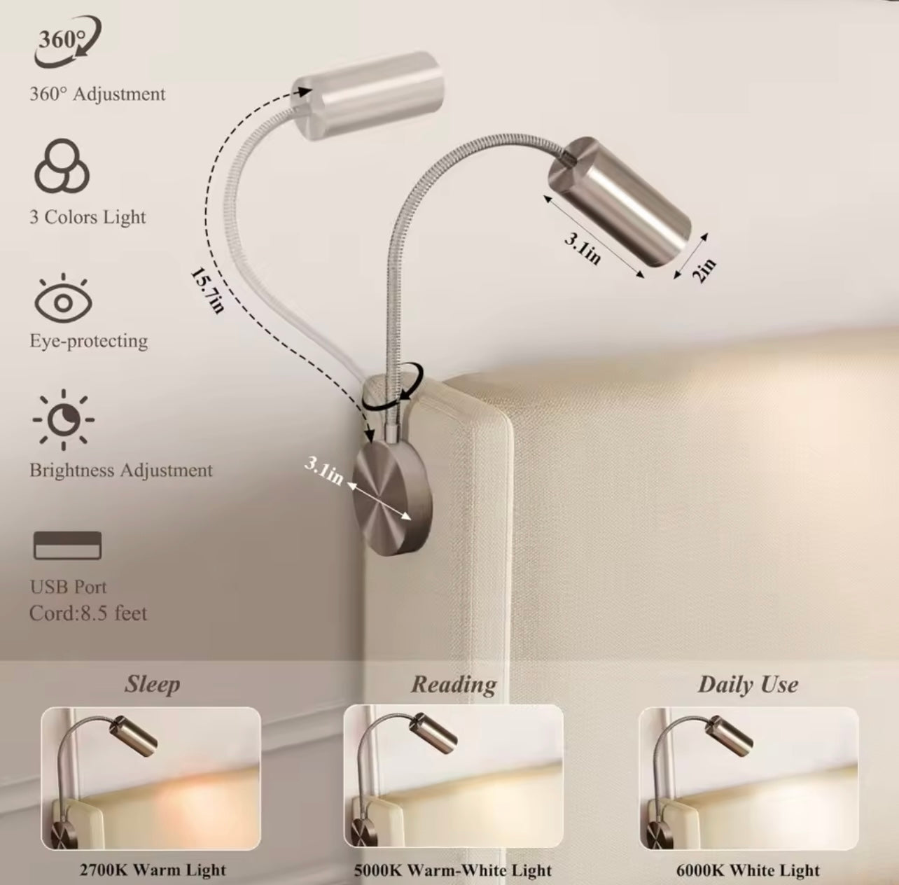 - Dual reading lights with 3 color modes and 360° swivel gooseneck