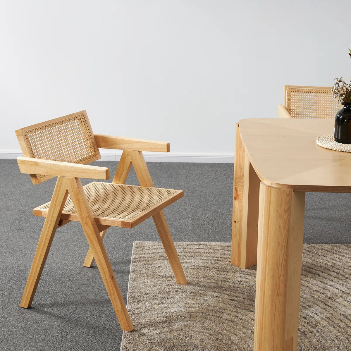 This set of 2 handmade cane armchairs combines natural solid wood with woven cane for a timeless look. Measuring 22.1”L x 17.9”W x 31”H, each chair is lightweight (14.4 lbs) yet strong for everyday dining or leisure seating. The wood finish complements rustic, farmhouse, and modern boho interiors. Perfect for dining rooms, living rooms, or balconies.