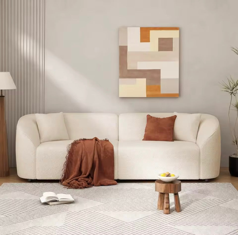 Wrapped in premium boucle fabric, this sofa offers a textured, plush feel while maintaining excellent durability. The boucle white color complements its refined shape and enhances its visual appeal.