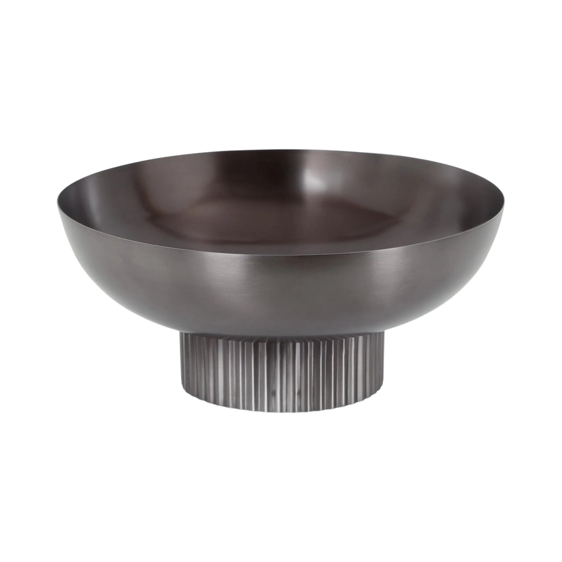 A modern ribbed metal bowl in a rich gunmetal finish, perfect for fruit, keys, or display. The raised pedestal design adds height and presence to kitchen counters, coffee tables, or entryway consoles.