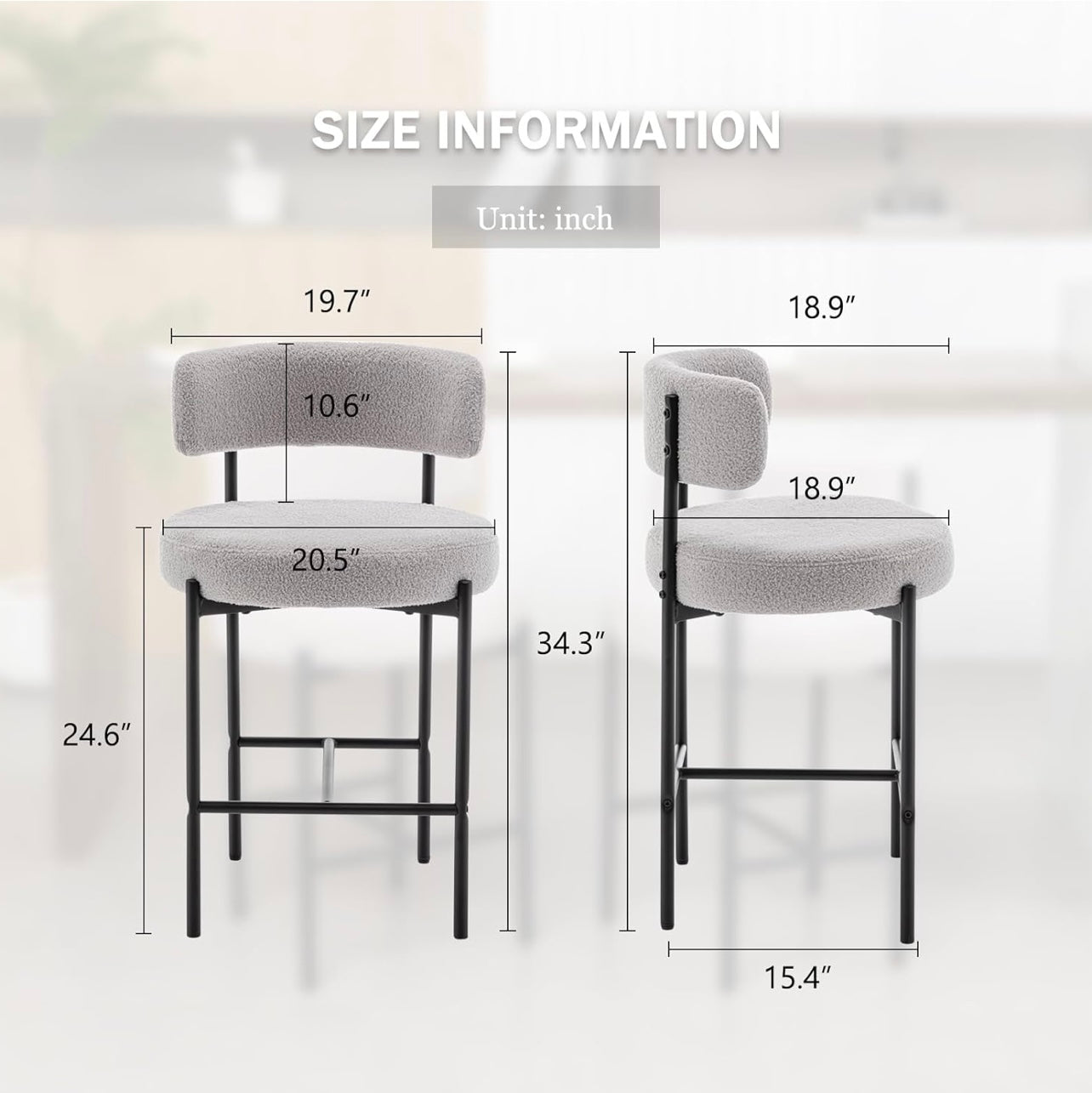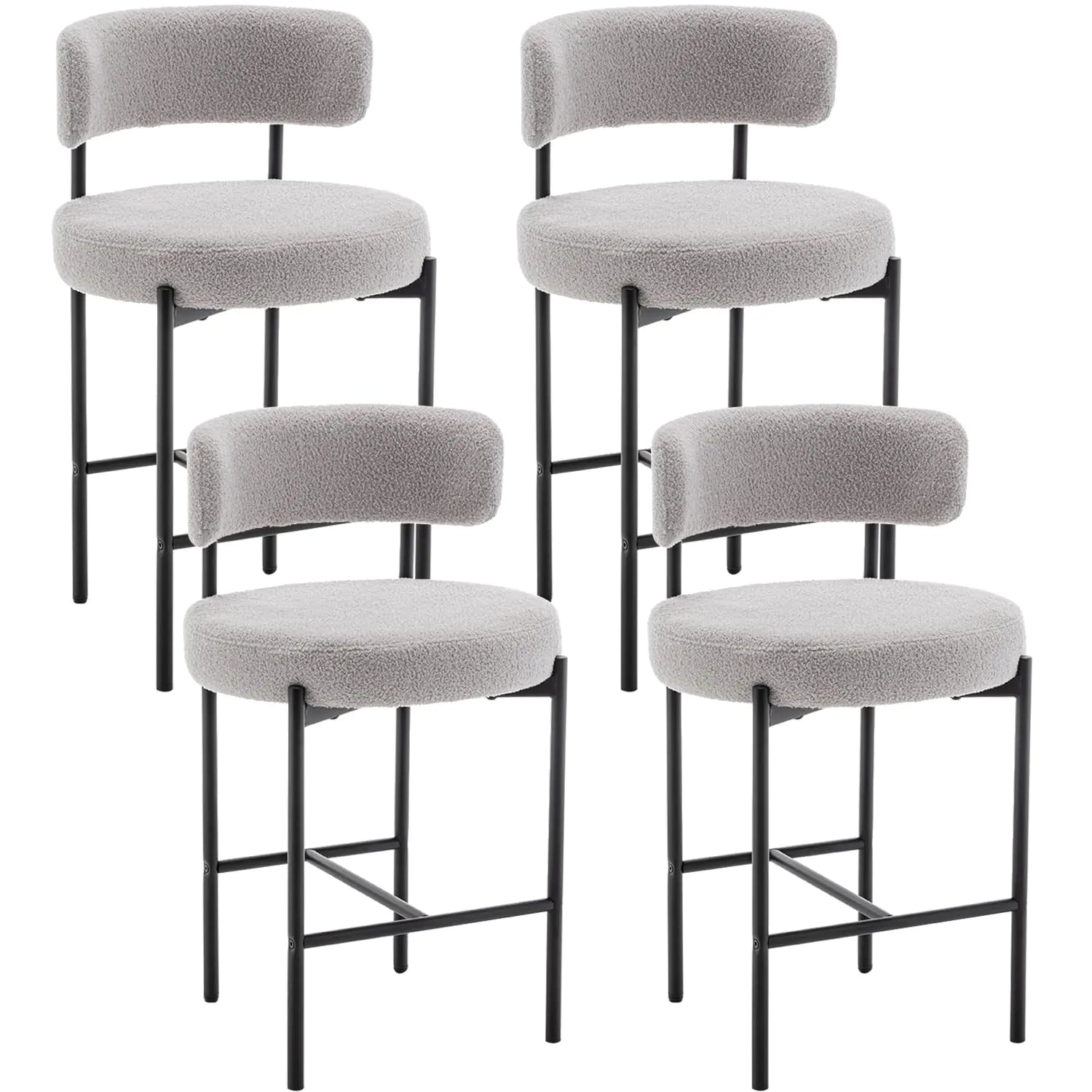 These boucle bar stools feature a rounded barrel seat, curved low back, and powder-coated metal frame. Upholstered in soft grey fabric, they combine luxury and durability for stylish seating in kitchens, cafes, or dining areas.
