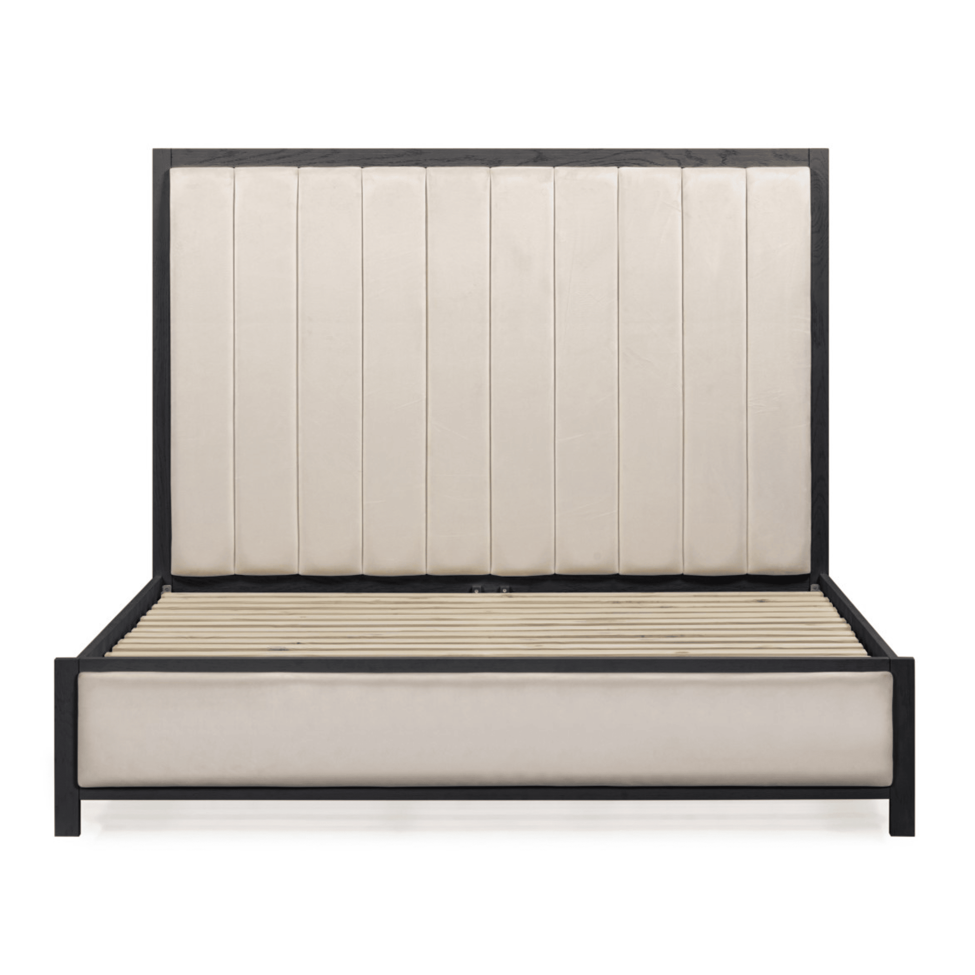 This statement piece features a soft cream velvet headboard and footboard, framed in a bold black wooden finish for striking contrast.