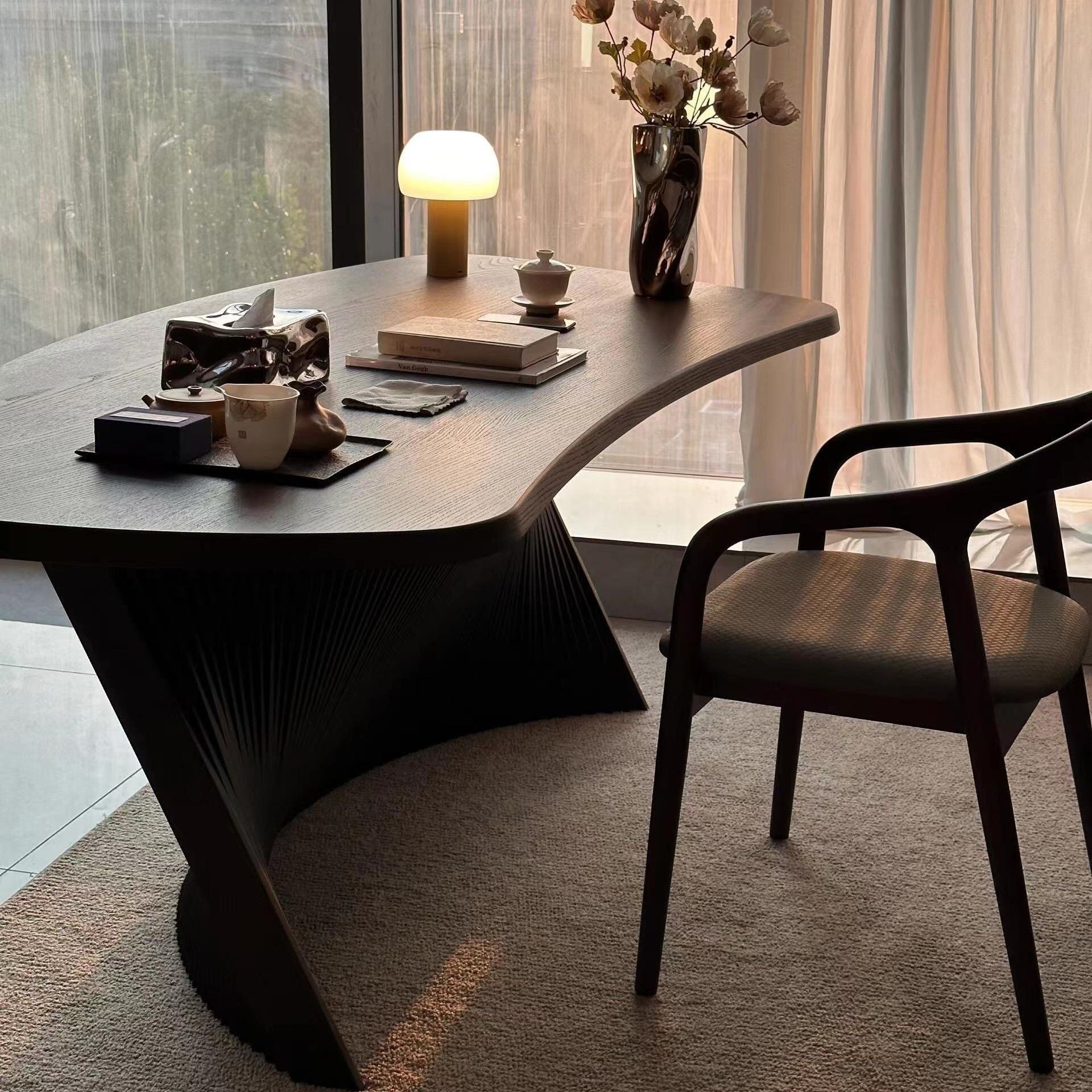 Built for professionals who value design as much as performance, this executive desk features a sculpted fluted base and a smooth solid-wood tabletop finished in a deep black tone. The curved front edge expands elbow movement for long, comfortable work sessions, while the wave-carved legs and scalloped detailing create a refined artistic silhouette.