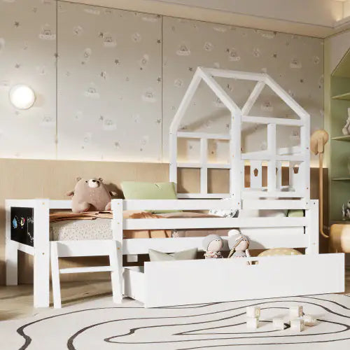 Full Size Wooden House Bed with Storage Drawers – Kids Bedroom Bed Frame