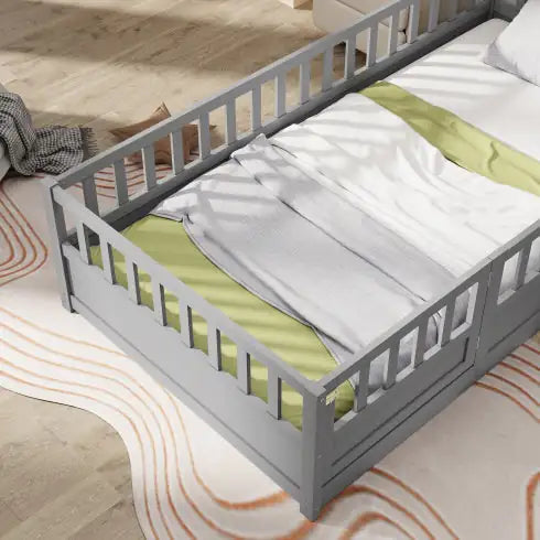 White Montessori Floor Bed, Toddler Bed with Safety Rails and Door