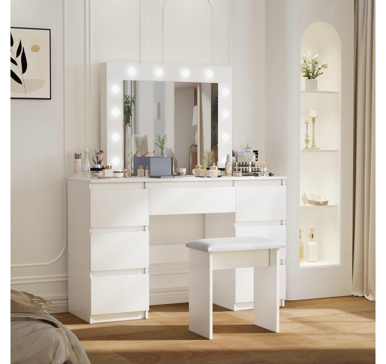 White Vanity Table - Vanity Mirror with Lights and Stool